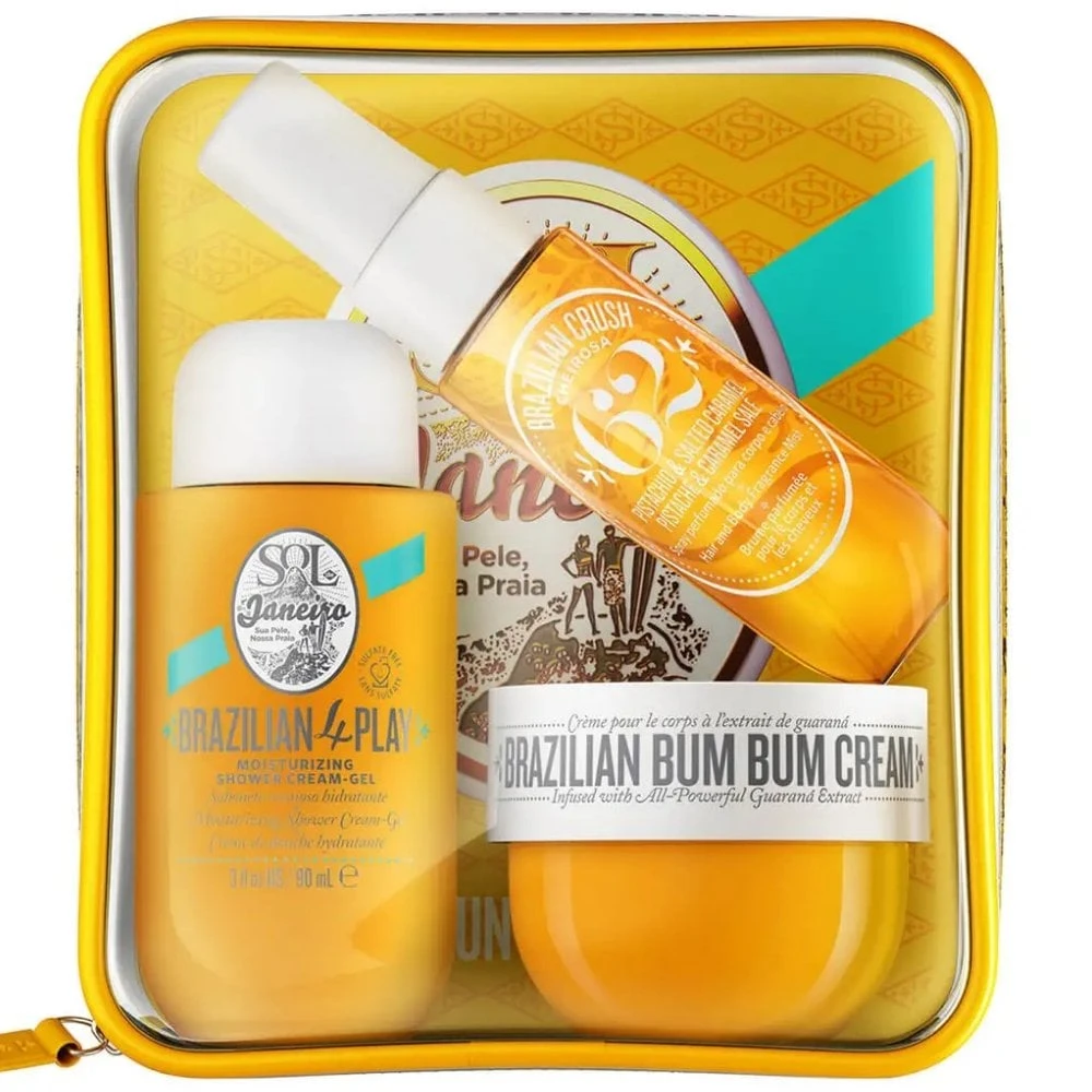 Sol De Janeiro Bum Bum 3 Piece Summer Jet Set is an attractive zip travel cosmetic bag containing a trio of Sol De Janeiro pamper products in travel-friendly mini sizes including Brazilian Bum Bum Cream, Brazilian 4 Play Shower Cream-Gel, and Brazilian Crush Body Fragrance Mist, all exuding the iconic fragrance with addictive notes of Pistachio and Salted Caramel.
