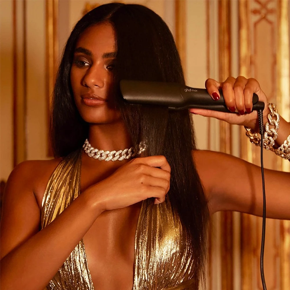 ghd’s Max Professional Wide Plate Styler is a new and improved successor to the iconic, award-winning Gold Max Styler. Favoured amongst hairdressers worldwide, this best-selling straightener boasts glimmering silver accents and high-quality iridescent black plates with a luxe gloss finish that offer quick and easy styling. This straightener is perfect for long, thick and curly hair.